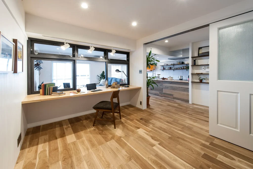 白を基調とした開放感あふれるリビング、少しラフで無骨なヘリンボーン張りの壁、住むほどに味わいを深めていく無垢材の質感……