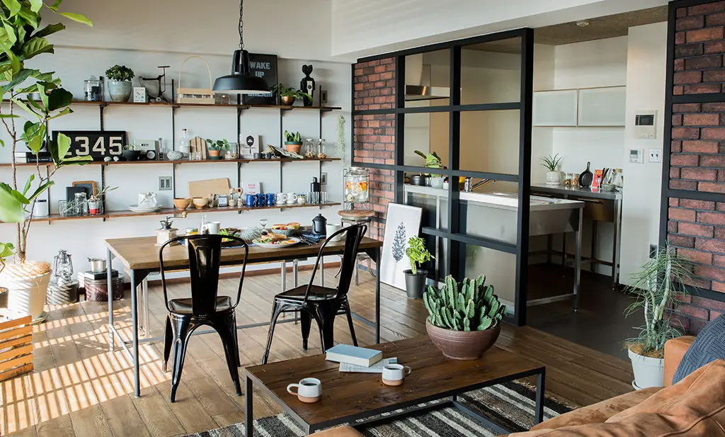 エイジング加工を施された無垢床材や、ラフな質感のレンガなど、