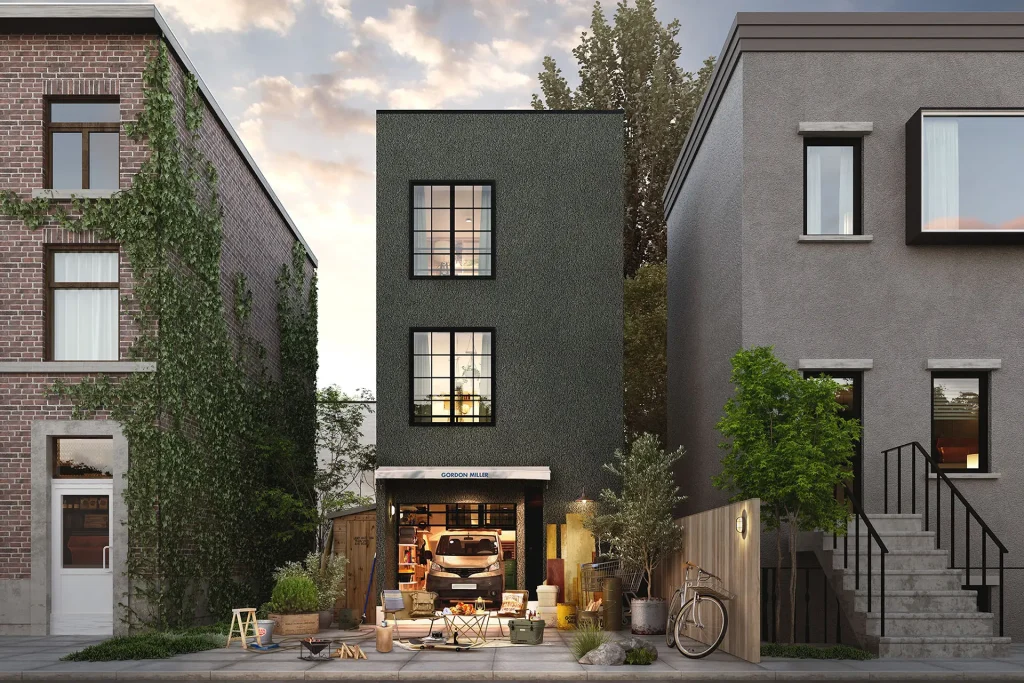 「GORDON MILLER」らしく素材感を生かしシンプルに仕上げた塗り壁の外壁と、落ち着きのあるモスグリーンの配色に。