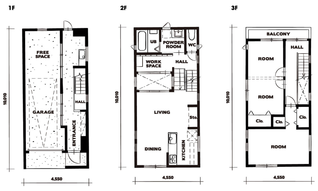 限られた敷地でも建てられるビルトインガレージを採用した、コンパクトな3階建てプラン。外観や内装はFLATタイプ同様、シンプルな塗り壁、モルタル、ウッド、アイアン、セメント板などの素材を生かし、シンプルに仕上げた。