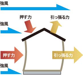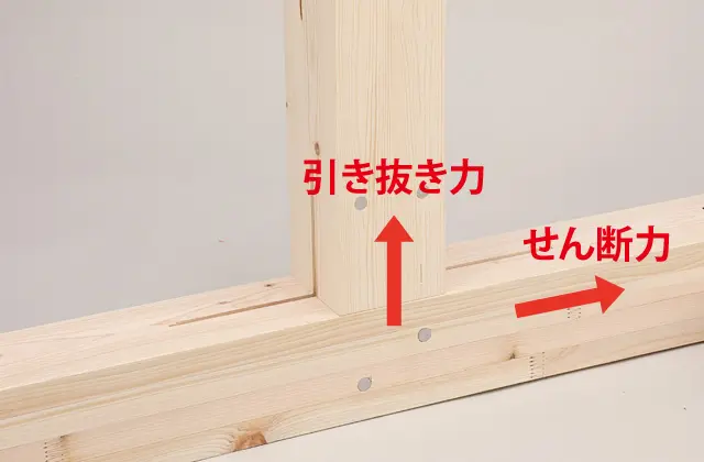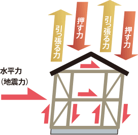 耐力壁に水平力がかかると、筋交いなどを介して、柱に引き抜き力とせん断力が働きます。パワービルド工法では、接合部に専用金物を使用し、その引き抜き力とせん断力に耐えうる強度を確保しています。